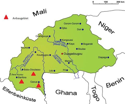 Ein kleiner geografischer Überblick von Burkina Faso und unseren Anbaugebieten (rote Dreiecke), in denen unsere Mangosorte "Amelie" angebaut wird.